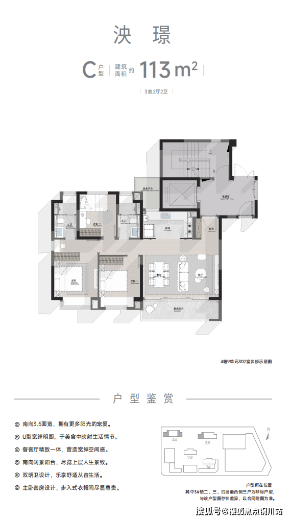 约113m²的产品,更拥有约5.6米横厅设计,采光面更宽,更充足;四飘窗设计,赠送面积更多。卫生间美妆冰箱,为业主想得更周到。不管哪种户型,卫生间花洒和龙头都是高仪品牌交付,淋浴隔断是玫瑰岛,厨房水槽和水龙头是科勒,全屋地板是生活家……
