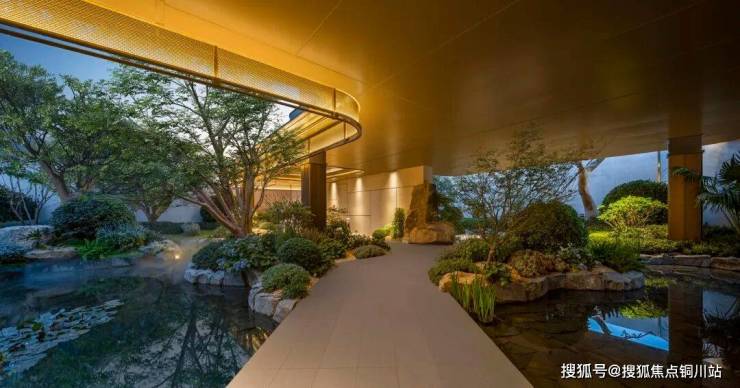 景观中庭的设计是市面上极为少见的三层观景式设计,以北宋画家范宽的《溪山行旅图》为范本,叠石、壑松及高低落差约15米飞瀑,亭台楼阁、檐下的游廊、小桥流水相互映衬,宛如一幅山水画卷。