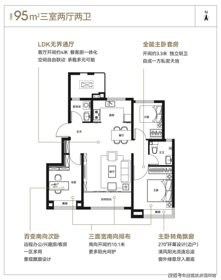 建面约95㎡户型,以“南向三面宽+双卧朝南”的硬核配置,成为现阶段新梅江最优三面宽产品。尺度舒适,实际可以拥有类建面约110㎡的空间体验感。