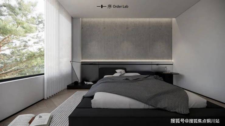 步入次卧,床头背景墙以简洁设计勾勒出独特韵味。上半部分的黑色木饰面,质感温润又深邃,触感细腻且肌理丰富,低调中彰显着沉稳与大气,仿佛为休憩空间披上一层静谧的外衣。下半部分的水泥质感涂料,原始质朴,其独特的颗粒感与灰调质感,带来一种坚韧、冷静的工业风韵致。