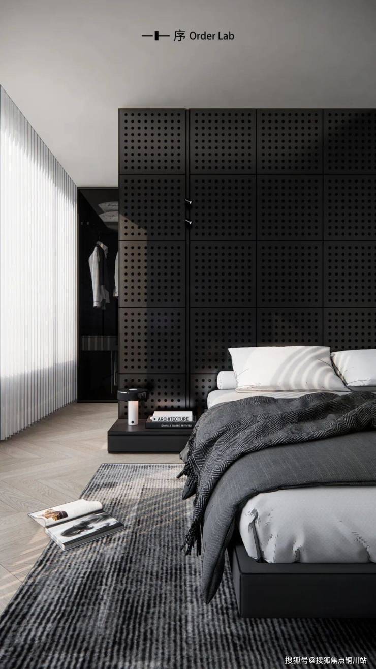 主卧后方巧妙规划出衣帽间,以金属洞洞板作隔断,整体色调采用经典的黑白灰,营造出现代感十足的高级氛围。地面铺就鱼骨拼木地板,其独特的纹理与排列方式为冷峻的空间增添了一份温润与自然的质感。阳光透过其间,光影交错,赋予空间独特的韵律之美。