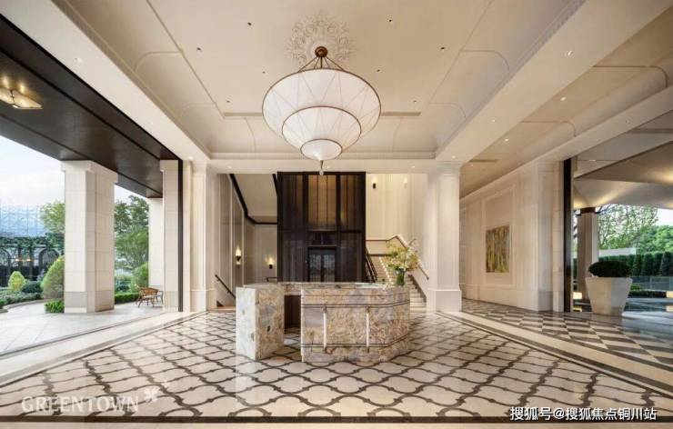华贵「玫瑰大堂」,地面采用“白玫瑰石材”和“宝珀灰石材”拼花铺设,接待台选用梵克雅宝大理石,简洁墙面融入微弧细节雕刻,尽显精致与典雅。