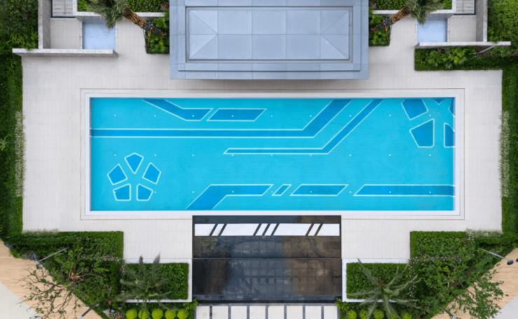 走出入园大堂出口,4棵银海藻,全冠移植,搭配户外泳池,度假风扑面而来。