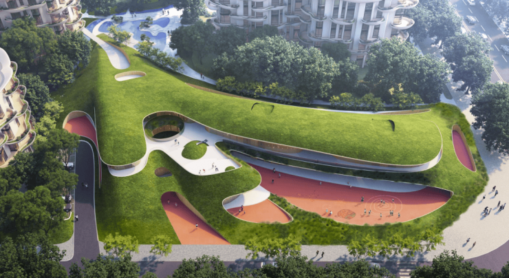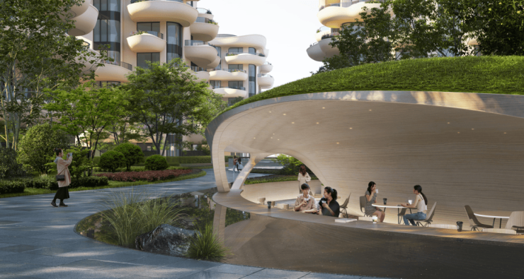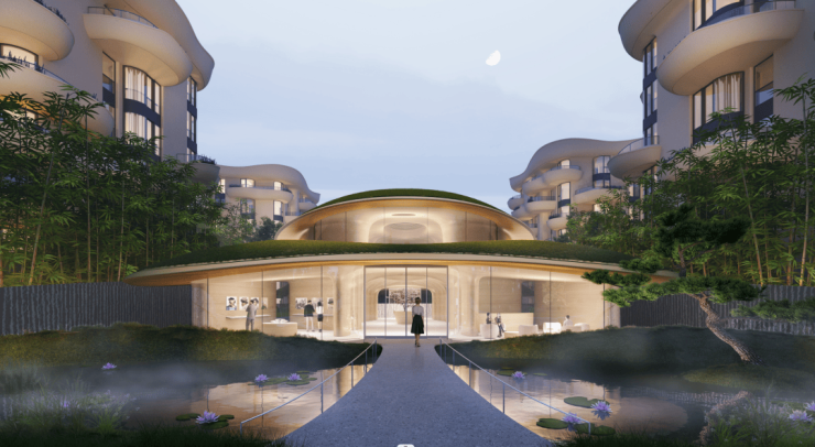 建筑上,秉承马岩松一贯的曲线浪漫,打造自然生长的“灵芝”建筑,赋予其蓬勃的生命力,又给人一种在云端漂浮的感觉,掩映在城市森林里,营造超脱尘世之外的境界,让人在城市的忙碌节奏里,有那么一刻,可以走进自我的理想国,既虚幻又现实,这是时代的表达,也是都市人群的内心期待。