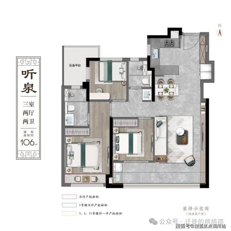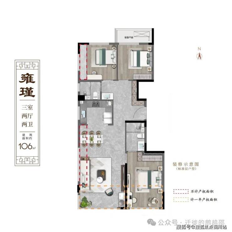 106㎡三室双卫,6.8米双阳台,赠送面积约9.36㎡;