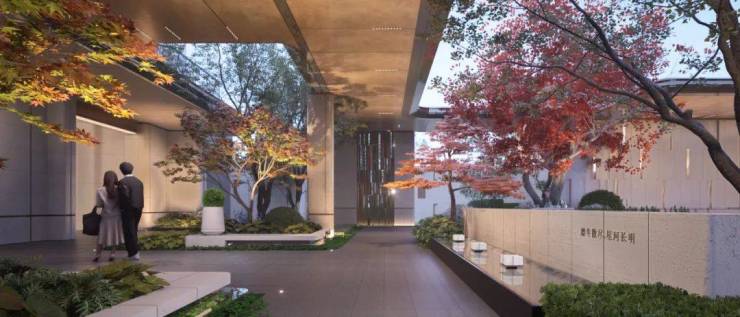首先看52米宽的社区大门。最亮眼最中心的,是以“嵩山云雾”为主题的雕塑。独创的港湾落客区和双车道进出大门,也充满仪式感。地下中央车站,这可以理解为地下停车场的落客区,不管是业主归家还是访客,既方便又尊贵。以上是第一进,前院区。