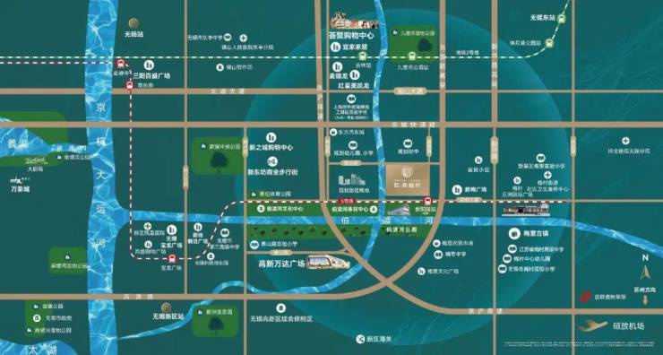 项目位于泰伯大道与新阳路交叉口西北侧,离地铁5号线新阳路站3号口(在建)直线距离约100米,毗邻伯渎河体育公园,周边3公里集结高新万达广场、梅里古镇、荟聚购物中心等繁华商业配套。