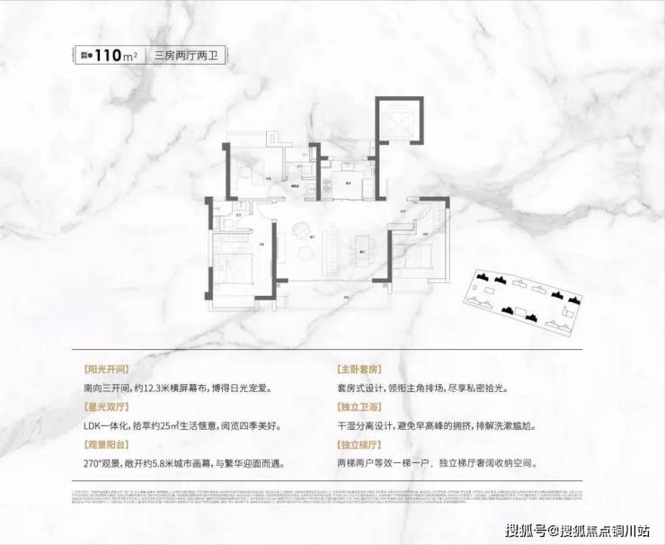 项目打造了10栋16-18层小高层住宅,两梯两户设计,包括建面约110㎡、120㎡、138㎡三大主力户型。