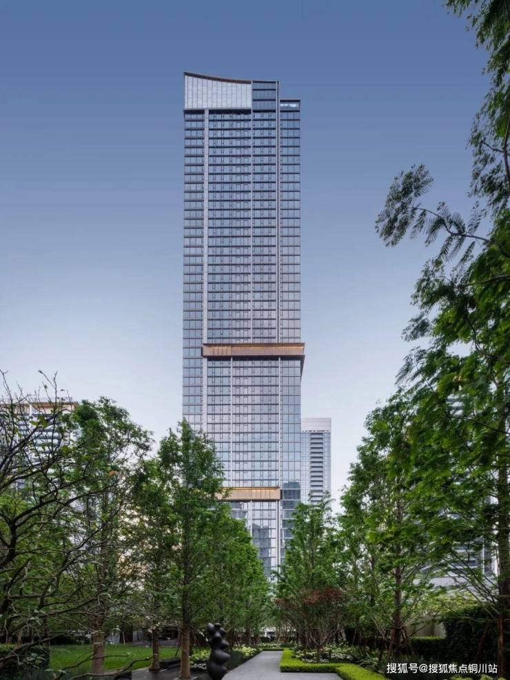 外立面运用国际视野和审美,设置竖向型材线条加强挺拔感,展现长江波光浩荡质感,以大江大河气韵,致敬土地文化。搭配“风帆”塔冠造型,融合鎏金腰线瑞字纹穿孔铝板,成为瑞府藏家身份的专属昭彰。