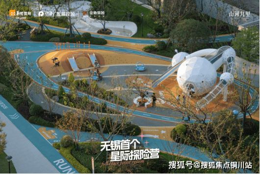 无锡华润山河九里“星际探险”乐园通过地形高差和蓝色塑胶基底,结合星际主题设计了滑梯、攀爬网等设施,激发儿童想象力与冒险激情。