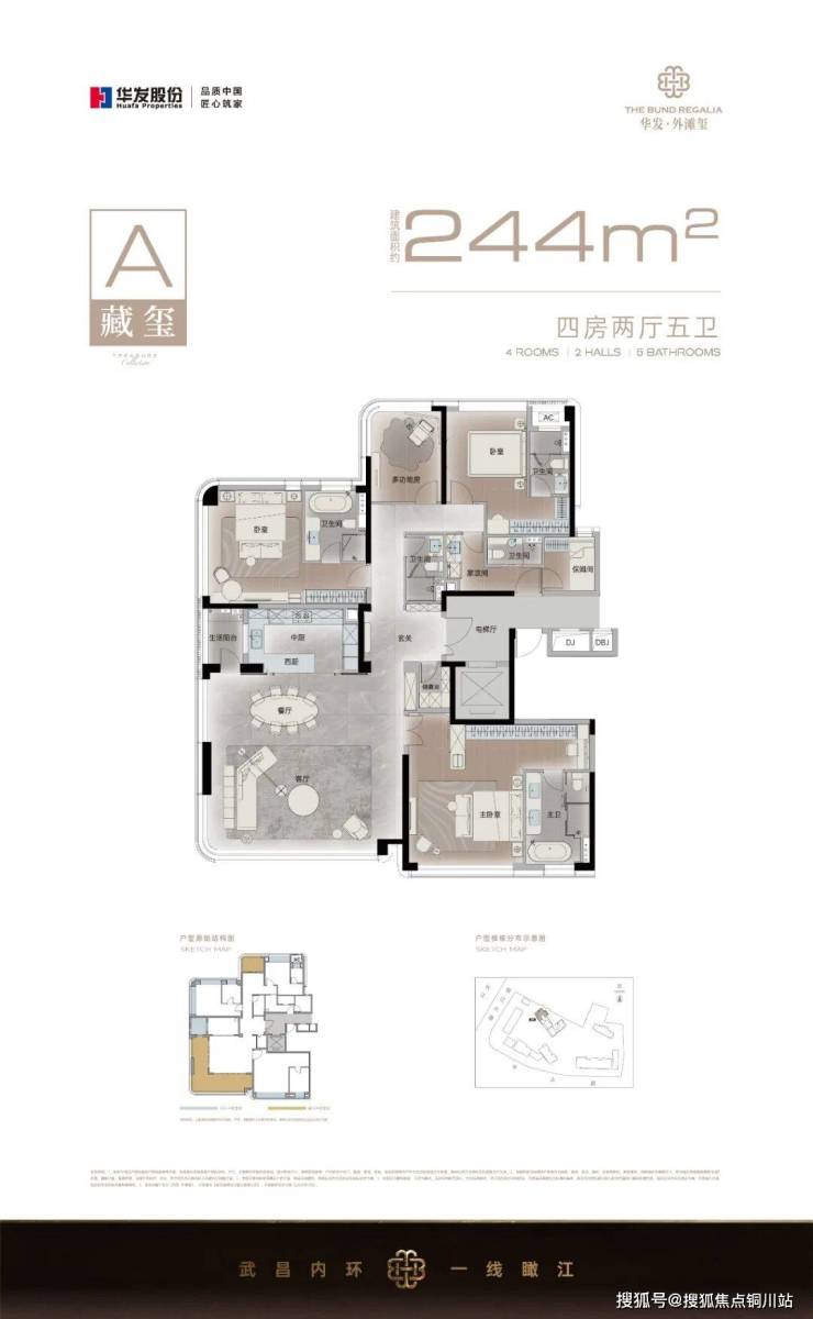 这是外滩玺建面约244平的四房五卫户型,