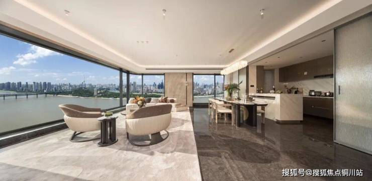 Ultra版环幕客厅采用无界转角270°全景舱玻璃幕墙,搭配8.0m*7.6m超大尺度全景方厅,江景与中庭园林景观双重映入室内,视野实现跨越式升级。