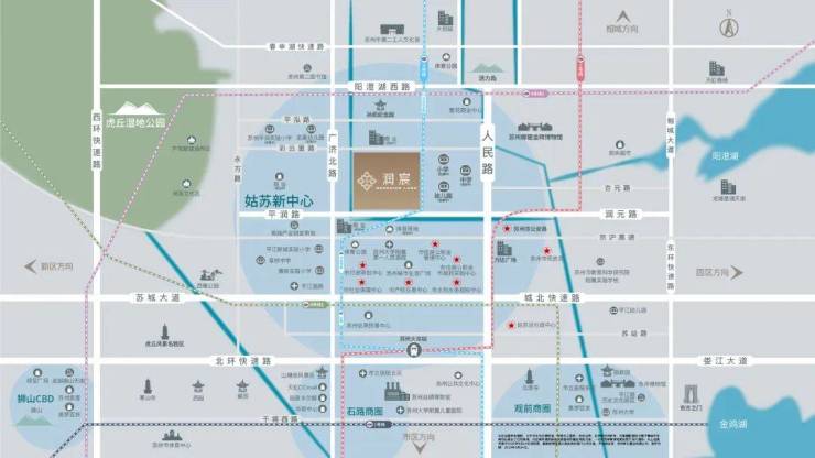 • 城市大动脉:广济北路、人民路两条城市干道,快速连通姑苏区山塘街、观前街等城市繁华区。春申湖快速路,快速通达园区及新区