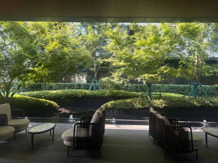 万科翠湾中城在社区打造上,对标的是国际知名酒店的标准,为业主带来酒店式度假生活体验。社区大门的环岛落客区灵感来源于上海宝格丽酒店,彰显尊贵与奢华;社区大堂复刻的是北京铂悦酒店,约 5 米挑高的入户大堂及石材组合拼花地面,搭配星级酒店办公休憩区,让业主回家的每一步都充满仪式感。屋檐架构上汲取了广州瑰丽酒店的设计灵感,单元入户门承袭东京虎之门安达仕酒店的风格,从每一个细节处为业主营造高端、舒适的居住氛围。实景图推开约两顿重的铜门,近 2000 平入户前厅,让业主仿佛置身于豪华酒店之中,尽享归家的尊崇感。