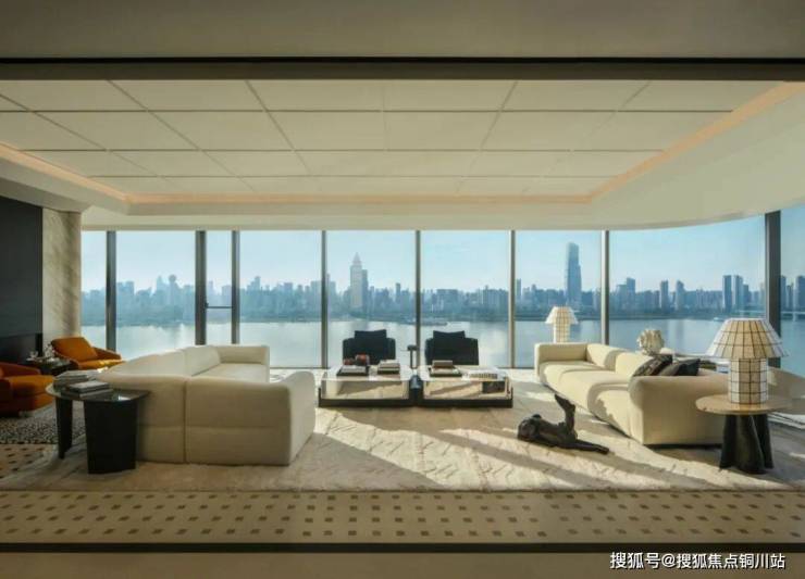 室内无柱、取消角柱的设计,让长江天际实现了尺度最大、视线最优的奢阔景观和居住感受。方正无柱的家庭公区空间,也让室内设计布局更为灵活,诸如沙发区、茶室、吧台区、宴饮区和第三空间等5大复合场景,可通过洄游动线进行串联,让每个场景保留独立性的同时,也让场景之间的切换更具礼序感和趣味性,社交会客和家庭欢聚,在此从容兼顾。