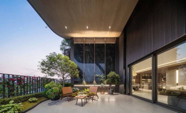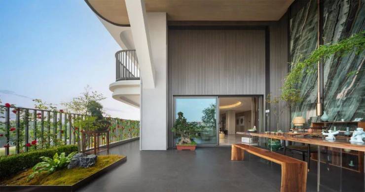 LDKBG 一体化设计,空间交互贯通:超扁平 LDKBG 一体化设计,将餐客厅、厨房、阳台、花园全方位开放贯通,整体形成洄游动线,构建 “端厅 + 空中花园” 无界串联的生活新主场,让室内外空间实现了全方位的交互,为业主带来了更加开阔、流畅的生活体验。