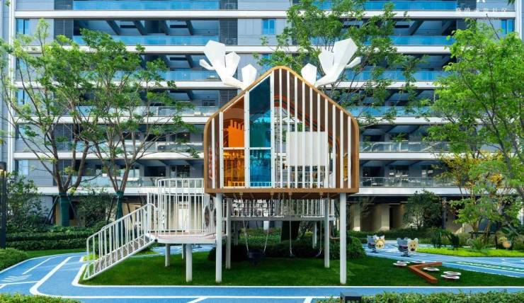 鹿鸣未来社区·友艺园与衢州市体育中心、爱琴海购物公园奥特莱斯隔路对望,园内部配置了氧气花园、童乐花园、认知花园、泳池花园、林下花园、草阶花园、康体花园七大主题花园,其中泳池花园拥有约300㎡的镜面泳池设计,还配置了约450m的健康环跑道形成一环贯穿全园。