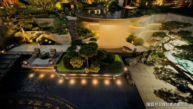 先看“城市花园会客厅”——下沉庭院。下沉庭院以“流水松石、飞泉叠水”为主题,营造出令人心旷神怡的空间氛围。