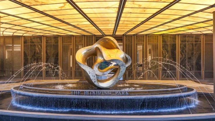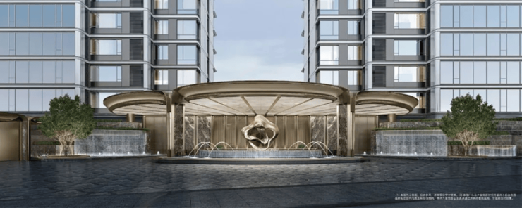 归家仪式感十足:以宁波市花山茶为灵感,打造约 60 米花瓣造型门头,搭配古驰黑奢石景墙与四重叠瀑水景,首创 “酒店式落客环岛”,归家动线如艺术展廊。