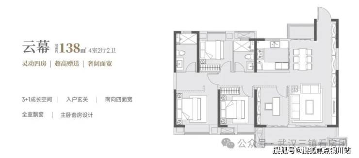 约138㎡【4房2厅2卫】四开间朝南,南北双阳台设计,IMAX景观视野
