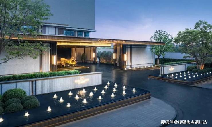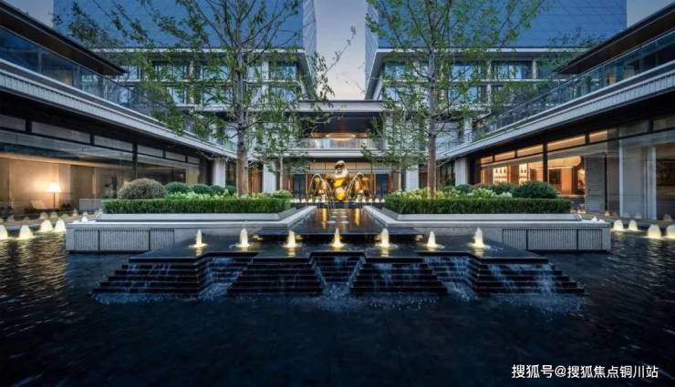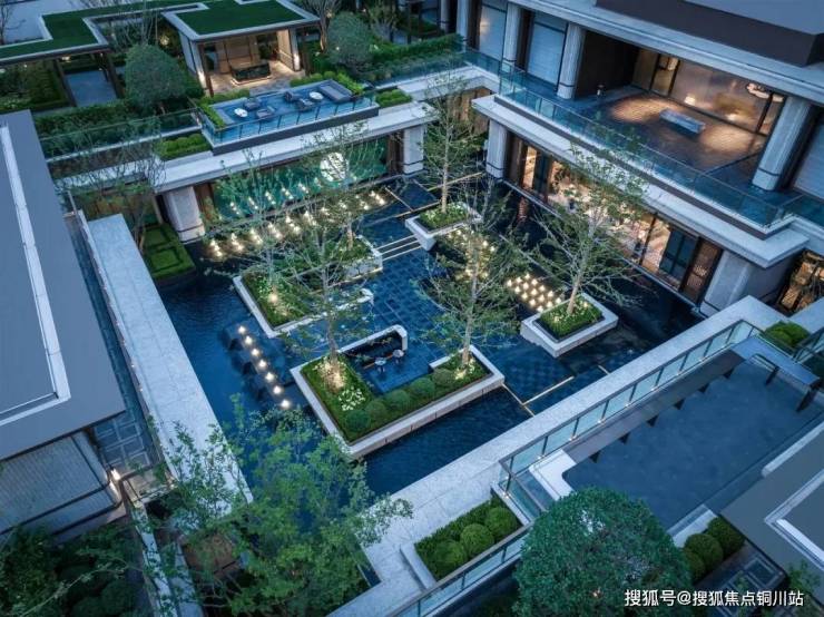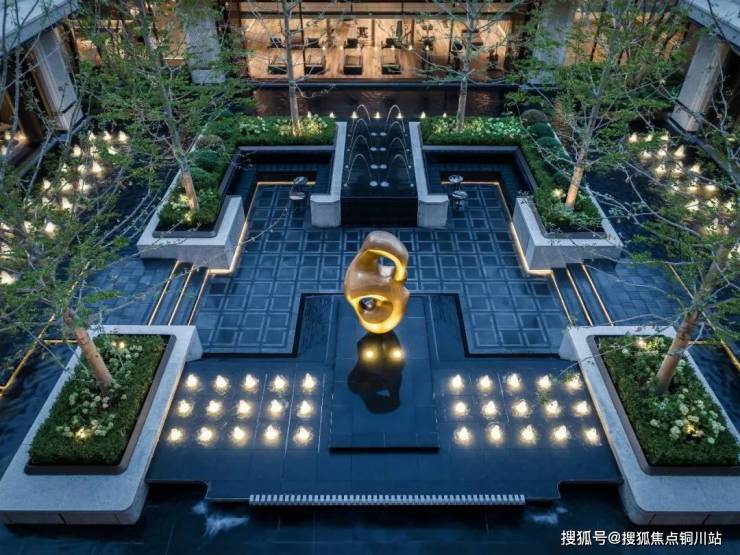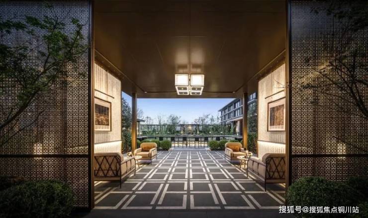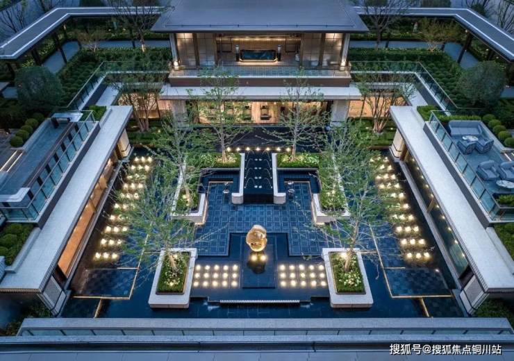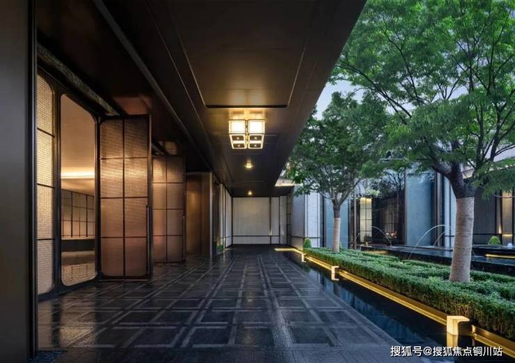 门口是很有对称仪式感的车马院,进门是高度对称的长廊水院,围绕着地面归家大堂展开的架空层、亭廊,以及围绕着下沉式庭院展开的会所空间,同样讲究「中轴对称」。