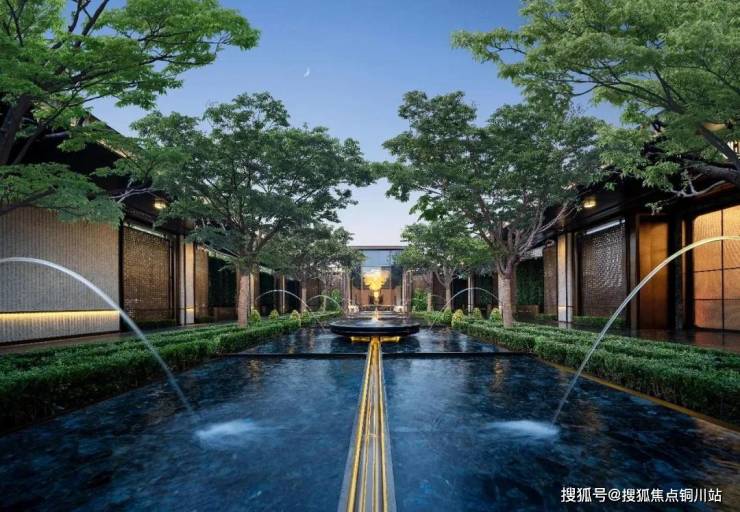 窗外又是高度对称的长廊水院。喷泉与长廊,给你对称仪式感;水光树影,给你静谧;玉石柱式与金属格栅,给你典雅。他们把准宝石级别的「蓝翡翠」奢石,铺装在水底,它有一个很美的名字,叫做「银河的眼泪」;阳光会把池底的那抹蓝色,反射到你的眼底。