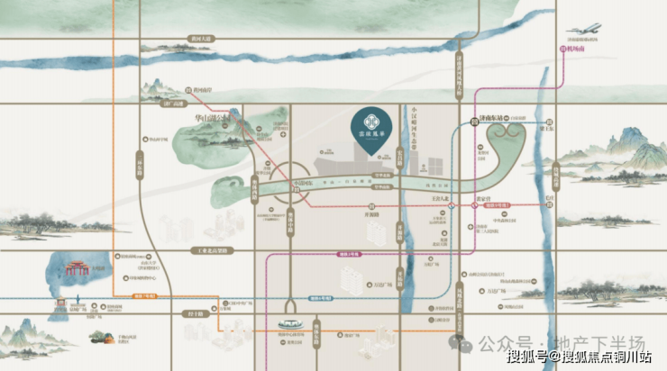 中建·雲啟鳳華引白泉之水入园,师法《千里江山图》,在望山景观轴和泉居归家轴上,为当代泉城铺展开一幅“可赏、可玩、可游、可居”宋韵美学百米山水长卷。