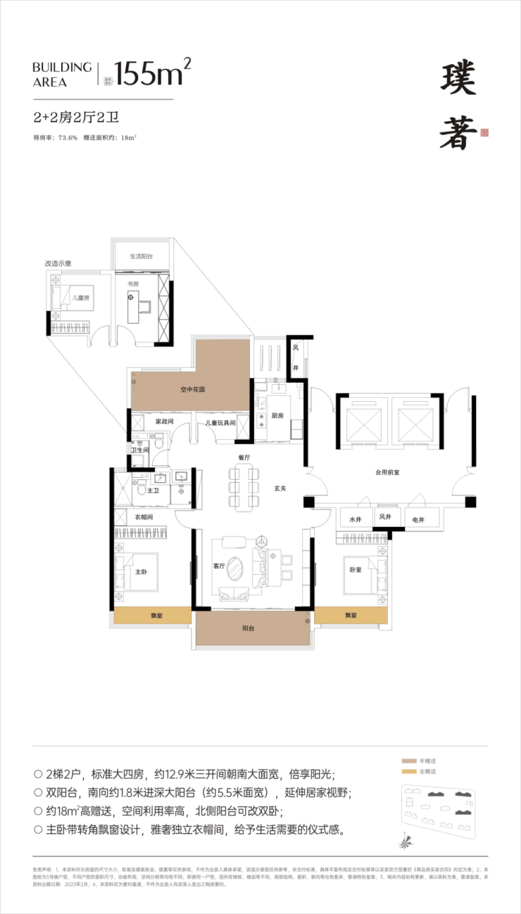 108/131平户型在南侧外围,临北三环高架的楼栋上;155/185平大面积段改善户型在小区中间;其中155平户型占比最多,达到45%。