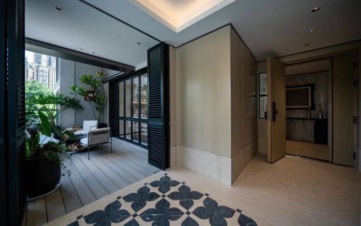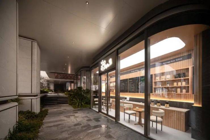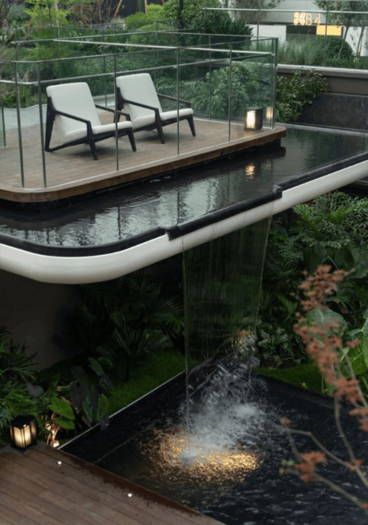 在有高差的地块,嘉宸没有走下沉式庭院的老路子(窗外有江,谁还会把视野围合在方寸庭院),而是用悬停的平台、错落的叠水,枫叶与乌桕穿插,让平铺的庭院竖了起来,形成园区的「3D照壁」,另一条悬浮的归家之路。