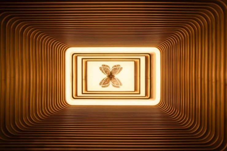 二用重楼向上延伸收束竖向视线,引人遐思;穹顶停留着嘉宸之蝶的完整符号,精美、轻盈、对称、灵动,是嘉宸的象形文字。