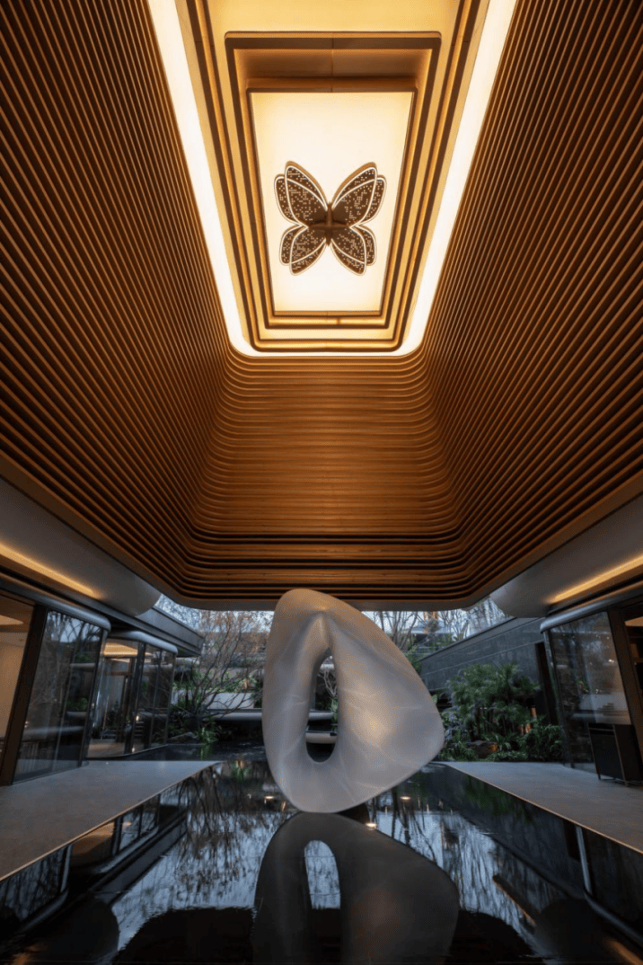 一用矩形水镜和「珠宝盒子」合拢横向视线,引人深入;水镜上单立一片翅膀雕塑,走近看才发现另一片藏在水镜中,虚实相依,是梦境与生活的隐喻;