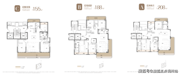 小区的其余中间楼栋为17/18层的小高层,户型为155-188-208㎡四房产品。