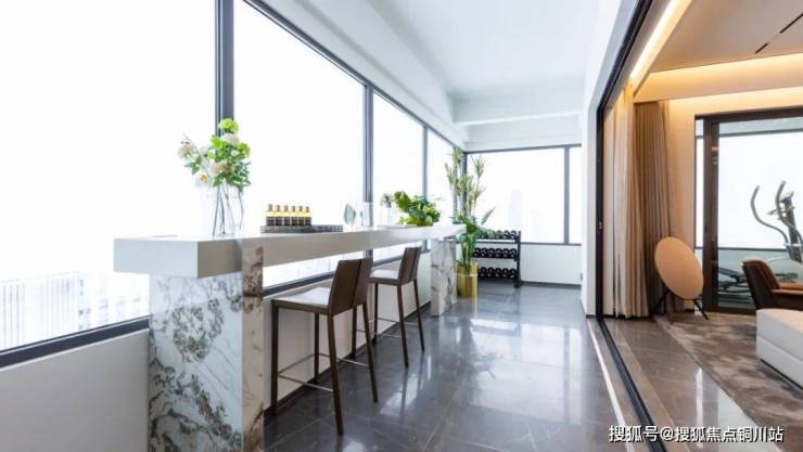 开间近7米的大横厅设计是样板间的特色亮点之一,阔绰的客餐厅一体贯穿,搭配大面积的宽幕阳台,空间感和尺度感十足。↓↓