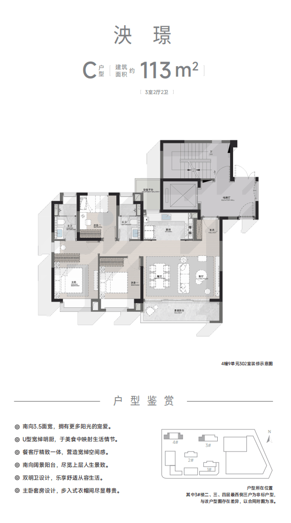 约113m²的产品,更拥有约5.6米横厅设计,采光面更宽,更充足;四飘窗设计,赠送面积更多。卫生间美妆冰箱,为业主想得更周到。不管哪种户型,卫生间花洒和龙头都是高仪品牌交付,淋浴隔断是玫瑰岛,厨房水槽和水龙头是科勒,全屋地板是生活家……