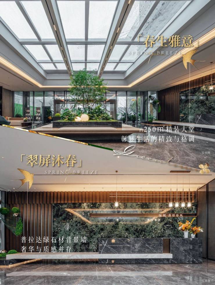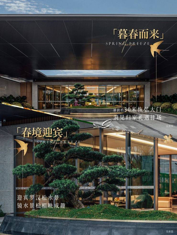 现代美学建筑立面:绿城・燕语春风汲取东钱湖的澄澈与通透,采用大面积 Low-E 玻璃,搭配典雅灰色涂料,打造出极具现代感的建筑立面。横纵交织的金色几何线条,赋予建筑刚柔并济的秩序之美,使其在阳光下更显轻盈与时尚,成为东钱湖畔一道亮丽的风景线。
