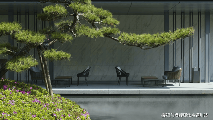 二进池泉庭院以"一池三山"为意境,镜面水景搭配乌桕、迎客松、红枫等植物,形成可游可赏的共享空间;