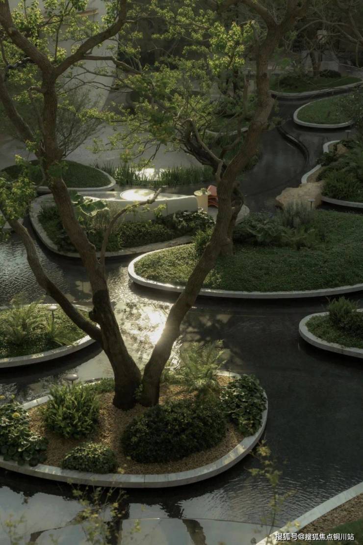 静谧的林涧之间,水面之上,漂浮绿岛自然又富有艺术感,浮岛溪流层层叠叠交错,乌桕与弯杆铁冬青林立在绿色浮岛之上,营造出静谧雅致的空间氛围。