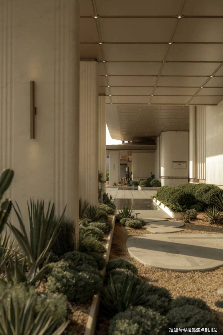门廊下的沙生植物花境与整形球灌构建出一个檐下休闲空间,弱化门厅立面的同时更显松弛与大气。