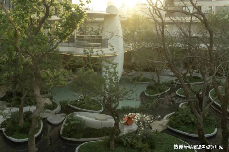 极致利用场地高差,打造双首层入户空间。设计双层架空的空间形态,打造立体式的散点园林景观,穿梭在岛屿溪涧中,度假式归家体验。