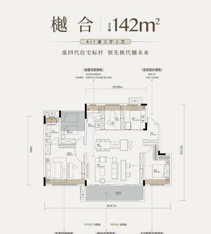 这是一个建面约142平的洋房户型,6个飘窗全赠送,南北两个阳台半赠送,正因为如此,能达到103%的得房率。