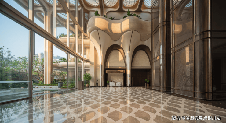 我们利用挑高优势构建垂直生态景观,让绿意向上舒展,在公共空间广泛使用了大量绿植。设计师将“江城之水”化作“无形之光”, 通过巨大的玻璃幕墙和内部镂空结构,让光线在一天中不断变化,与植物和材质互动,创造出动态的、有生命力的平衡感。当您归家,迎接您的不只是建筑,而是能让身心即刻松弛下来的阳光、空气与绿意。