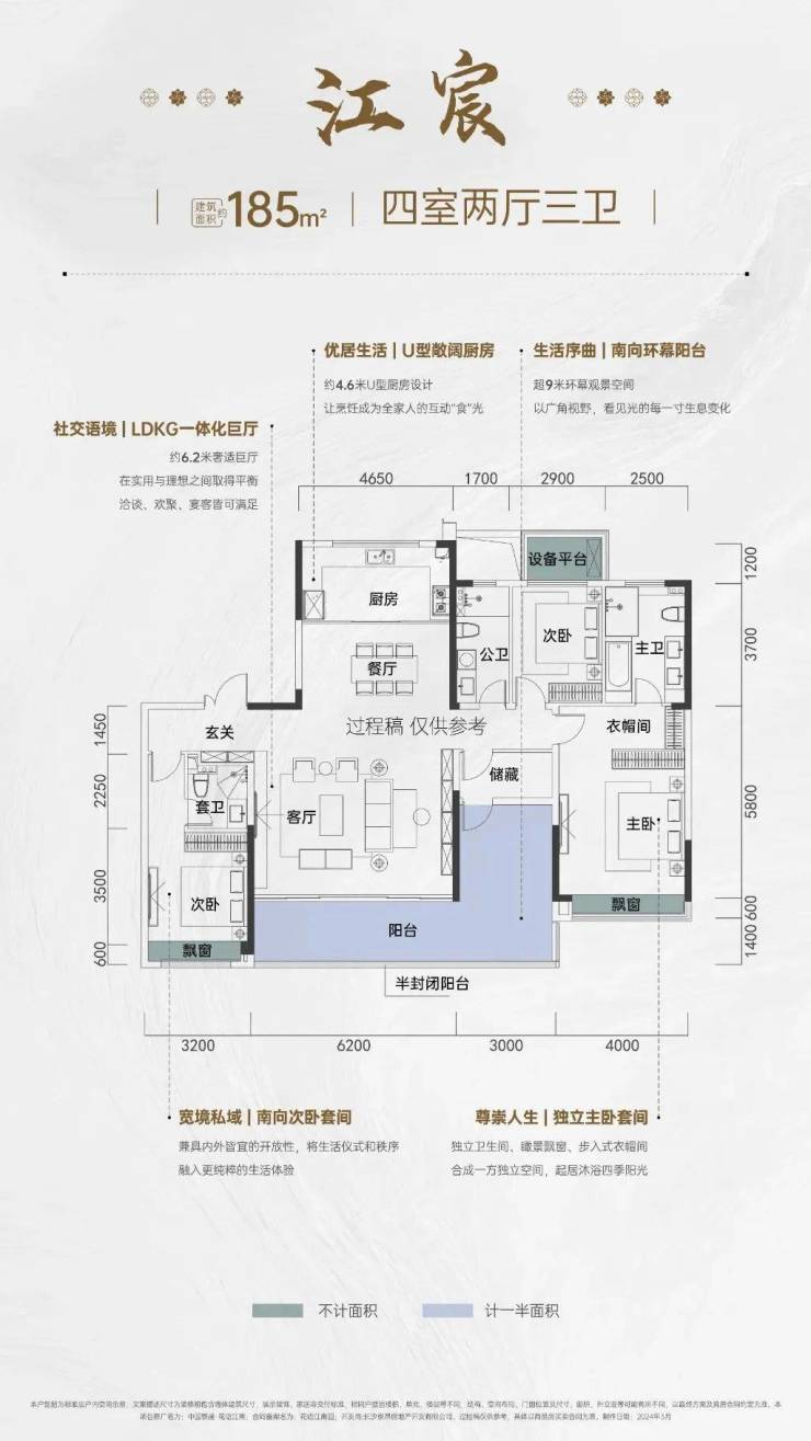 建面约185㎡大四房,约16.4米南向面宽可实现双套房朝南+1次卧朝南。