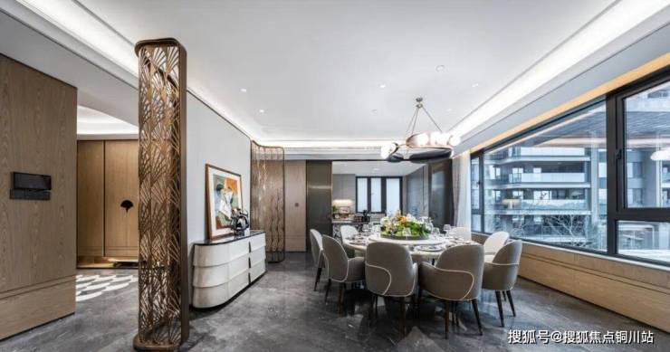 在电梯前室过渡归家的心情后,推开1.5米对开的厚重入户大门,从玄关步入约70平米的一体化客餐厅,藏不住的大宅风光,透过全明的大幅面落地门窗倾泻而至。