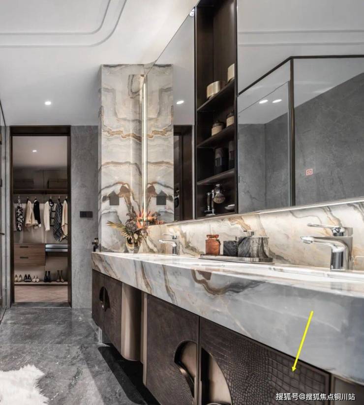 洗手台下的柜面拒绝了木饰面,而是选用了与奢石绝配的鳄鱼纹路皮革面。