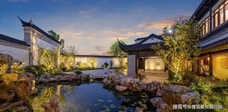 入口处,采用徽派青瓦白墙式门庭,三进礼序,中轴对称布局,颇具东方美学气韵。空间组合,层层进阶,两侧小桥流水,迎宾入府,造景水池,微波荡漾。营造出轴进有序的景观层次,周游天地,天人合一。