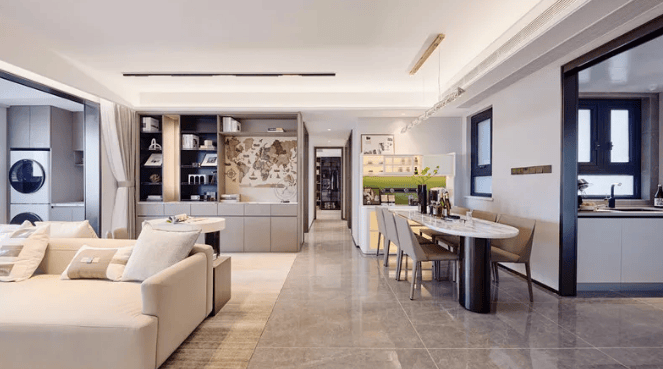 入户配置贴心挂钩,玄关柜门及内部采用双饰面板,配置鞋柜精灵,中部为人造石台面,下部设置感应灯带,预留扫地机器人插座……室内还配备人体感应小夜灯、窗帘盒灯带等多项魔鬼细节。当然,还有中央空调、地暖、新风三大件,全部给你配齐。