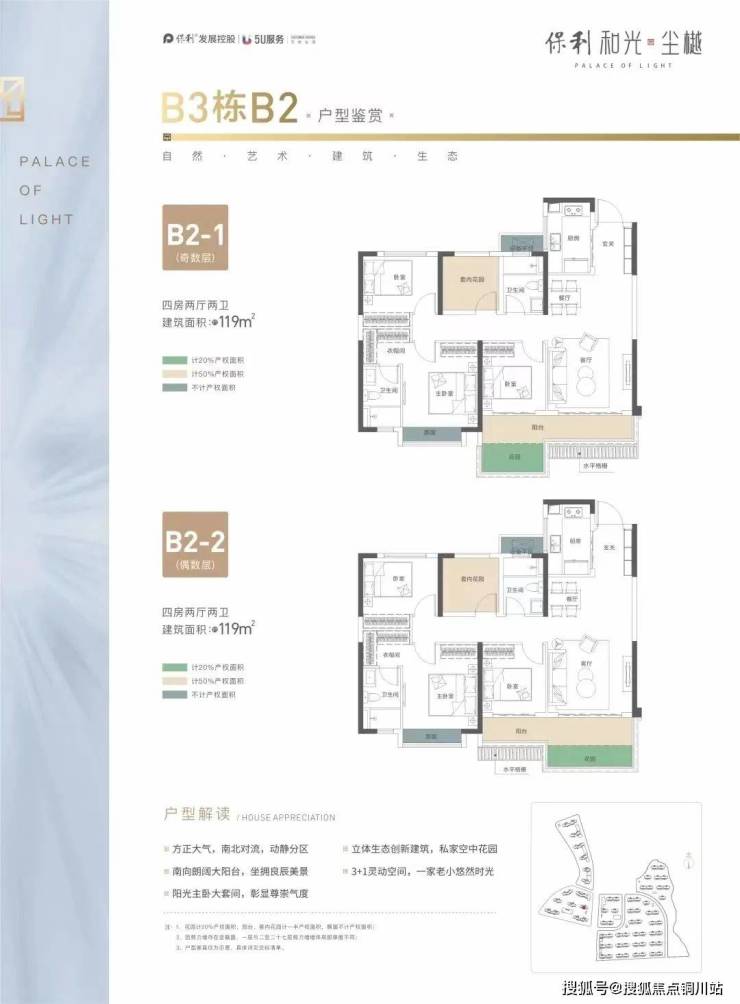 建面约117/119㎡户型:格局方正,罕见四房设计,动静分区,带超大南向阳台和庭院,赠送率很高。