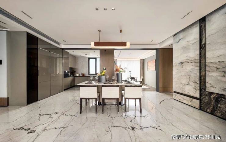 这里虽是一座巨厅,但餐厅是相对独立的,摆得下大圆桌。这一点,就连B新盘的建筑面积约170㎡都做不到,天樾玺却用更小的面积做到了。