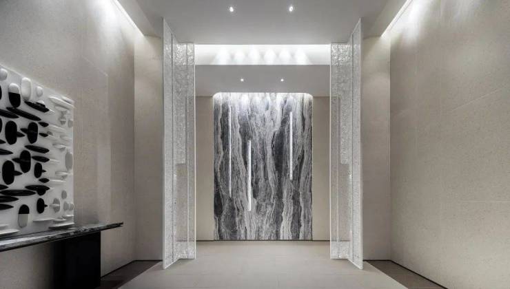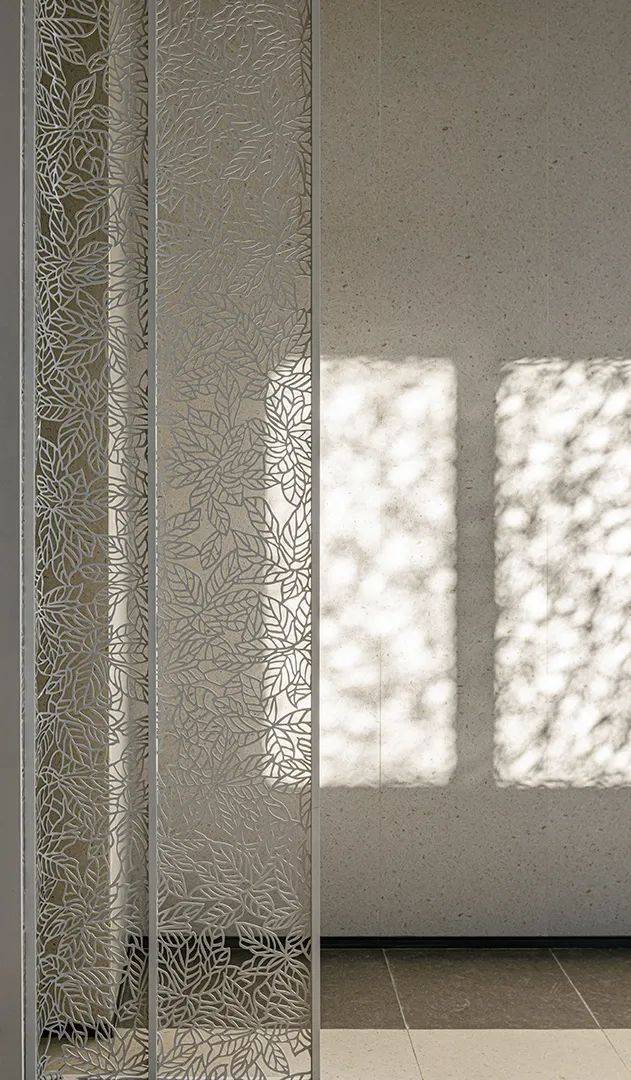 单元大堂约4.8米挑高,还有梧桐叶造型的金属镂空装饰,搭配超大面的石材背景墙,很用心。