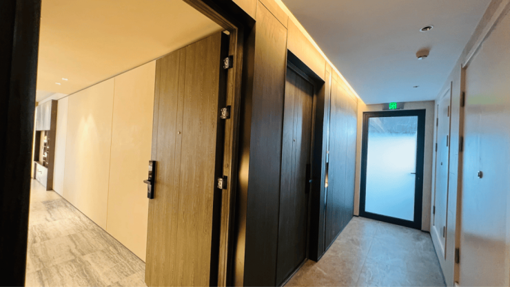建面约141㎡是一梯两户设计,两户并排,门口全部是木饰面包边,品质感很强。